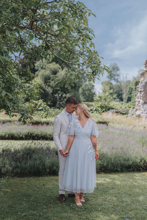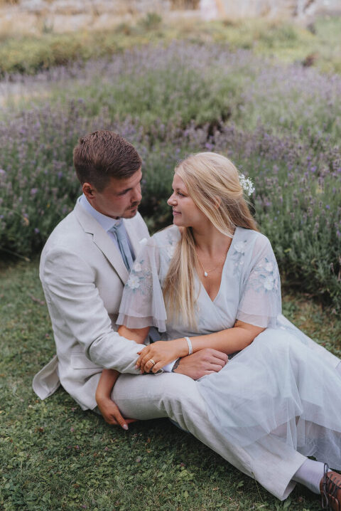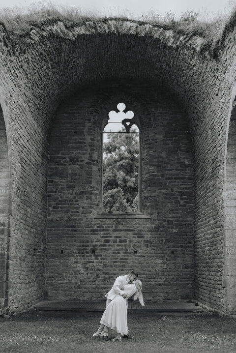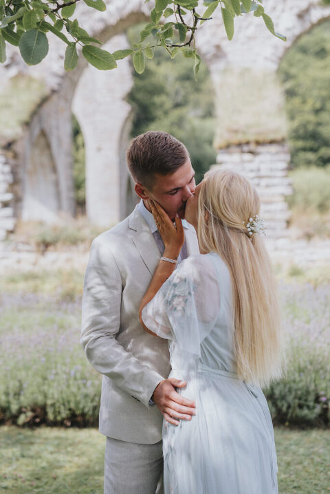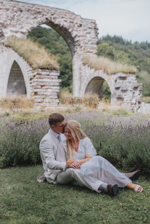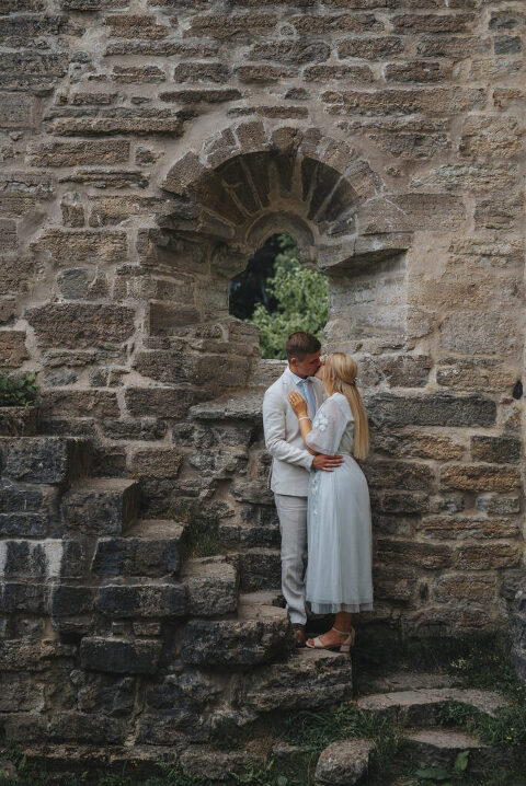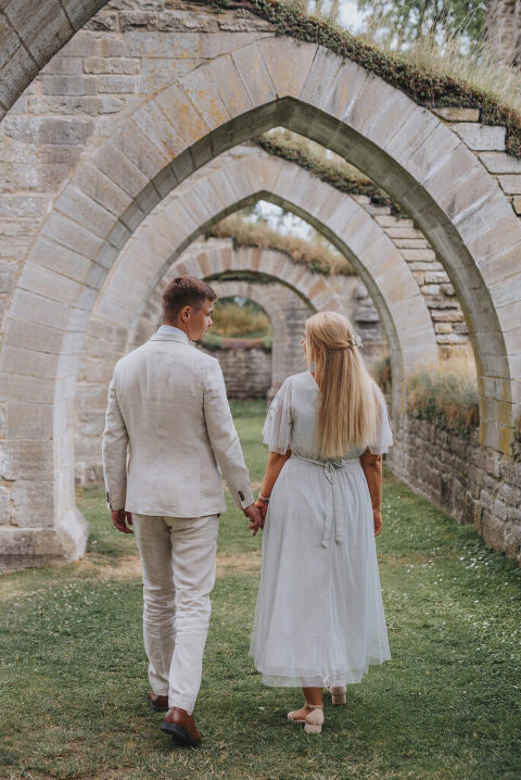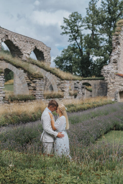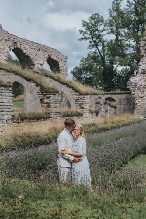 Dagen innan Rebeccas och Jockes trädgårdsbröllop möttes vi upp i Alvastra klosterruin för att ta deras porträttbilder – så himla mysigt och avslappnat!