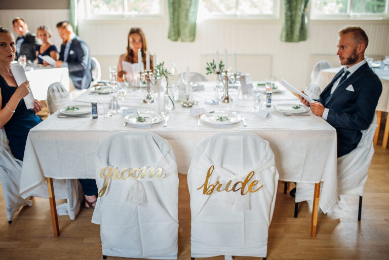 Båda två blev kanon, jag hade hemskt gärna velat göra bordsplaceringen själv eftersom jag sett fram emot det mycket – men då jag tänkte göra det på bröllopsdagen så gick schemat inte ihop sig om vi även skulle hinna bli fotograferade innan vigseln. Buketten hade jag beställt via Interflora (närmsta florist var 8 mil ifrån bröllopet och vi hade inte möjlighet att beställa därifrån) och jag beställde en i storlek Stor till mig och en i storlek Medium till Joline som var min tärna – men de var nog båda i storlek Liten när de kom.. Så himla besviken på att det var en liten tight bukett att jag ett tag inte alls ville ha några blommor. Monica räddade upp det med massa fin fjällvide och jag kan inte vara mer nöjd, även om den inte blev som tänkt :-)