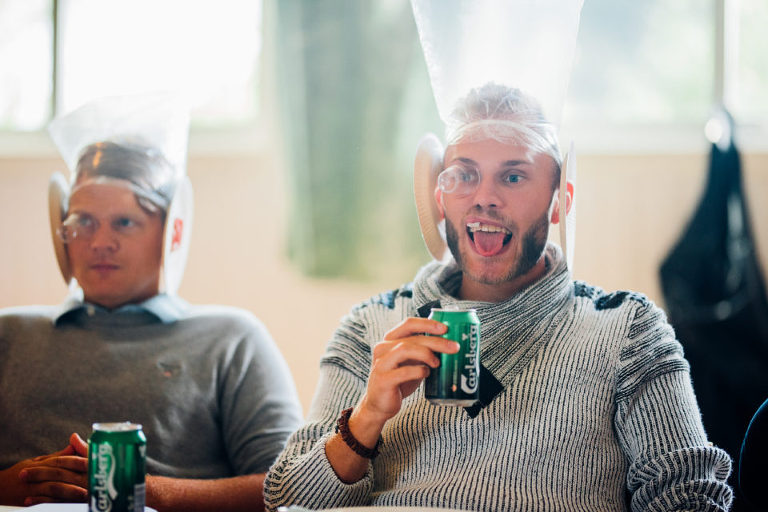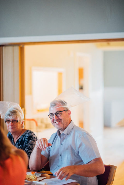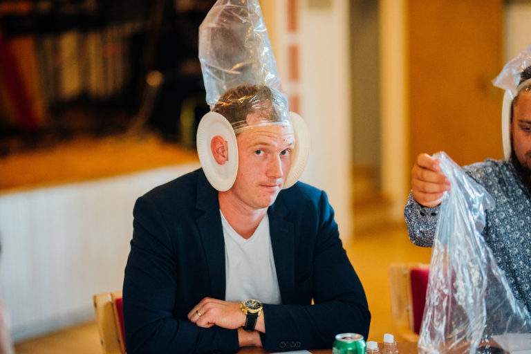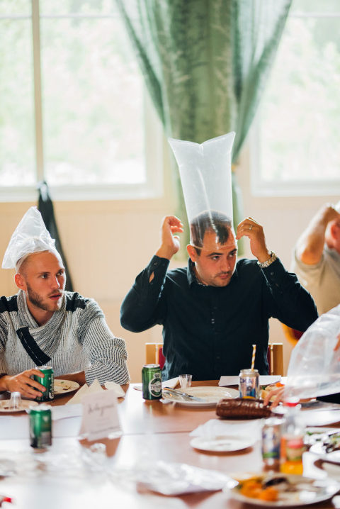 Under middagen hade våran toastmadame Caroline förberedd olika lekar, bl.a. en av dem ni ser på bilderna här nedan och som är ganska vanlig har jag förstått, men aldrig gjort den tidigare själv och det blev rätt roligt faktiskt att se alla med plastpåsar och sockerbitar ;-) En annan lek var att jag skulle hitta Kristoffer bland fem-sex andra killar, men jag fick bara känna på deras händer och underarmar och han skulle hitta mig i ett tjejgäng, men han fick bara ta på vader och fötter – vi båda prickade dock rätt! Vilket kändes rätt skönt kvällen innan vårt bröllop ;-)